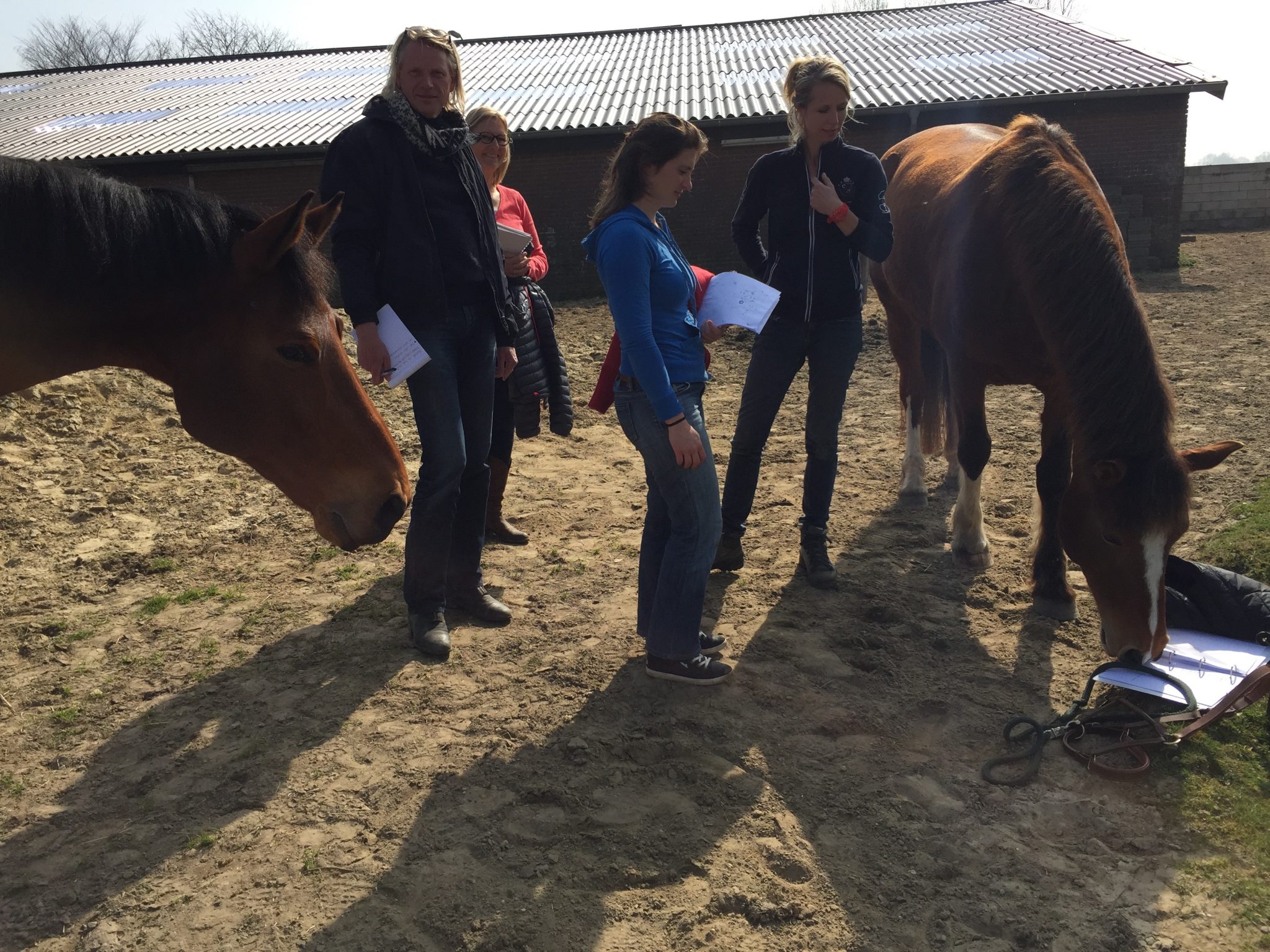 ”Een van de paarden liep achteruit naar Sophie toe. “Zij ging met haar achterbenen tegen Sophie aanstaan. Sophie kreeg rode wangen en vertelde dat ze heel veel energie voelde. Coby vertelde dat de levensenergie (wortelchakra) van het paard in de achterhand zit en dat Sophie zich mocht opladen aan haar.”
